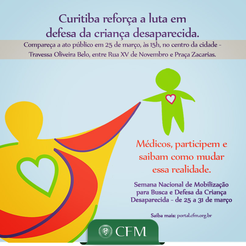 Com o objetivo de chamar a atenção dos médicos e da sociedade para o desaparecimento de crianças e adolescentes no Brasil, o Conselho Federal de Medicina (CFM) programa ato público durante a Semana Nacional de Mobilização para a Busca e Defesa da Criança Desaparecida, que acontece entre 25 e 31 de março. A ação conta com apoio do Conselho Regional de Medicina do Paraná (CRM-PR).