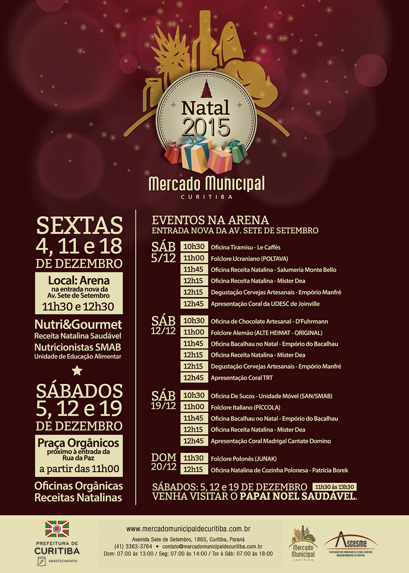 Um Papai Noel saudável vai receber as crianças que visitarem o Mercado Municipal no próximo final de semana, no sábado das 11h30 às 13h30. A ideia do Papai Noel saudável é promover a substituição da tradicional distribuição de doces às crianças por frutas. A programação do Natal 2015 no Mercado também inclui diversas oficinas, com receitas natalinas, e apresentação de corais de grupos folclóricos.